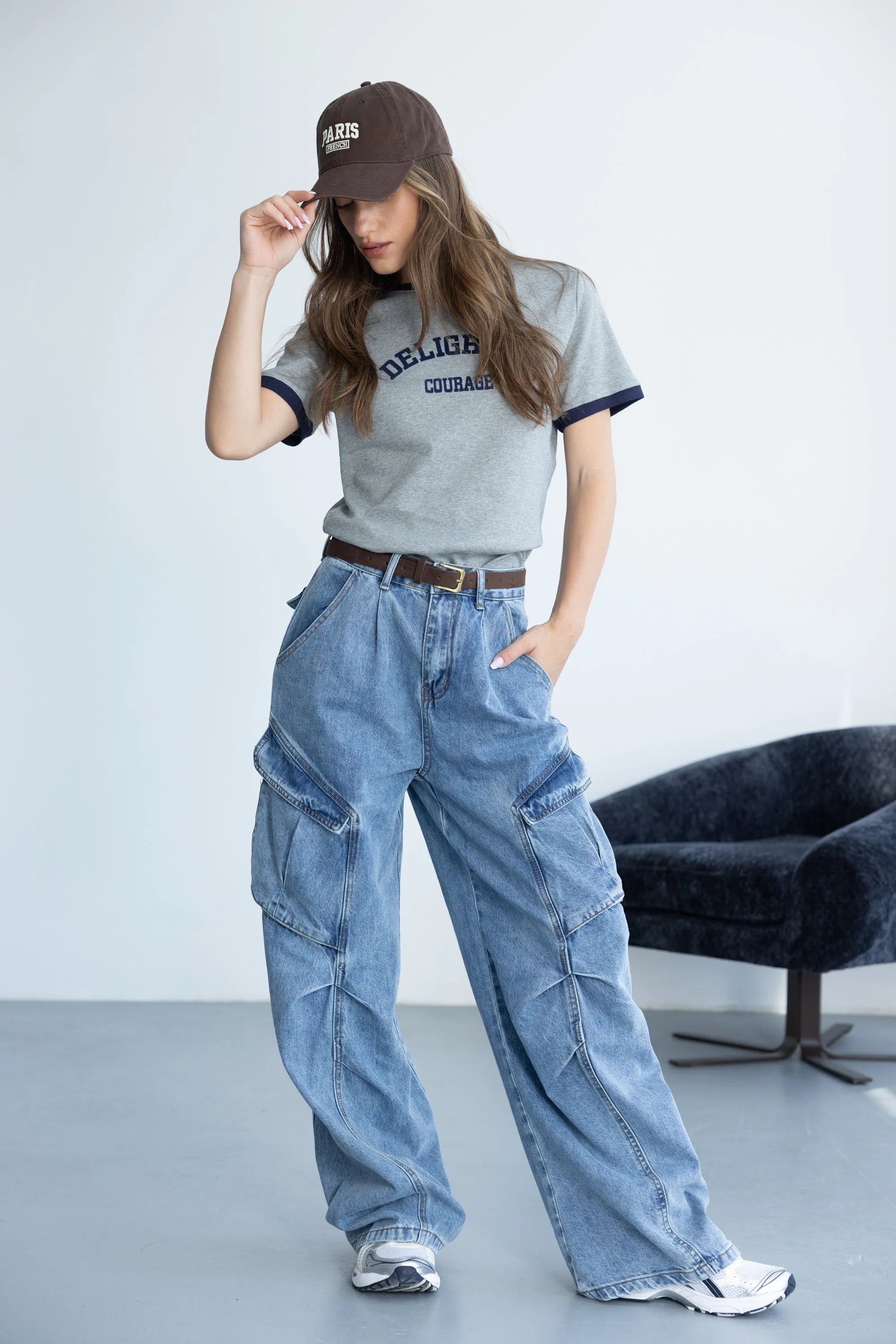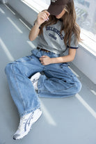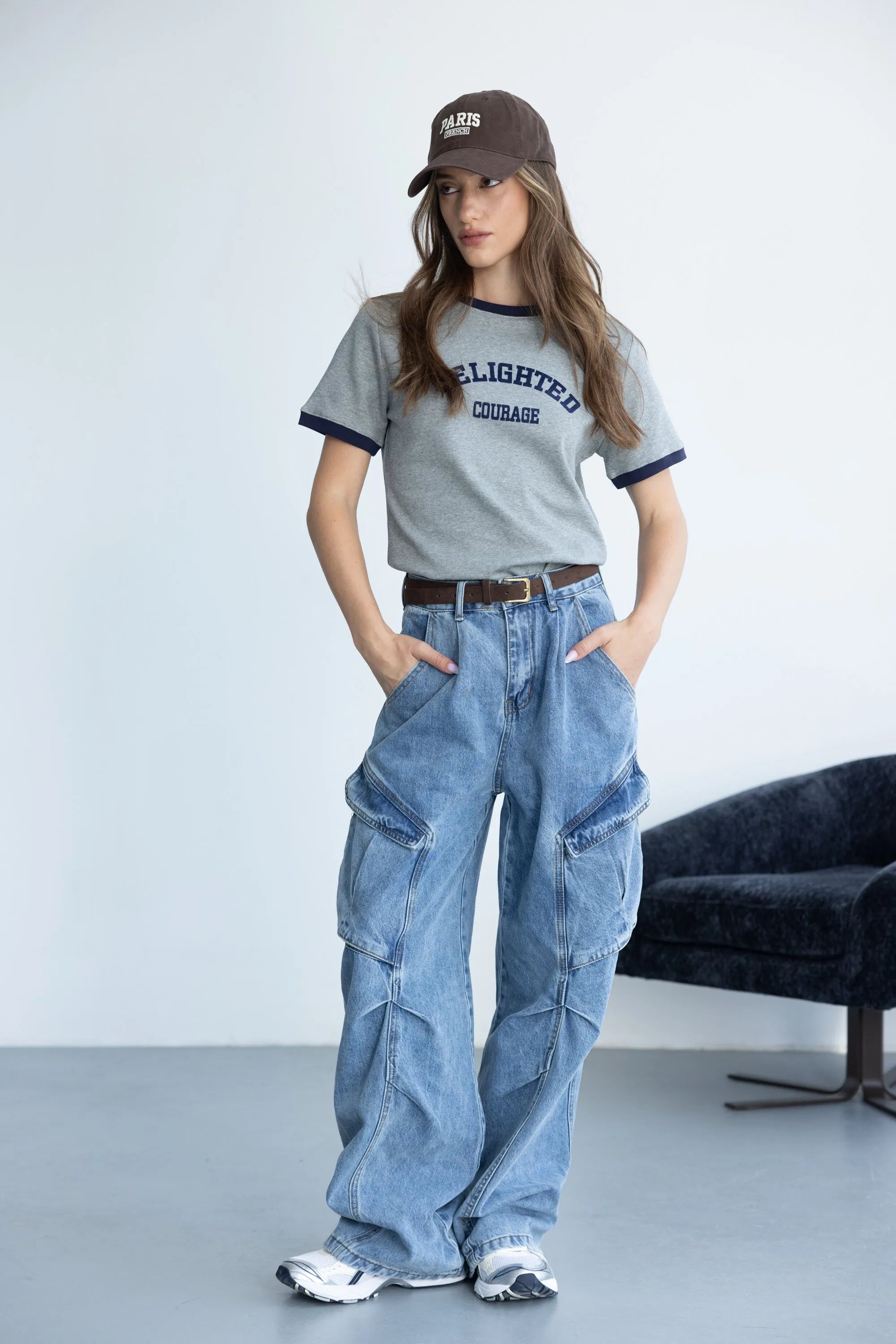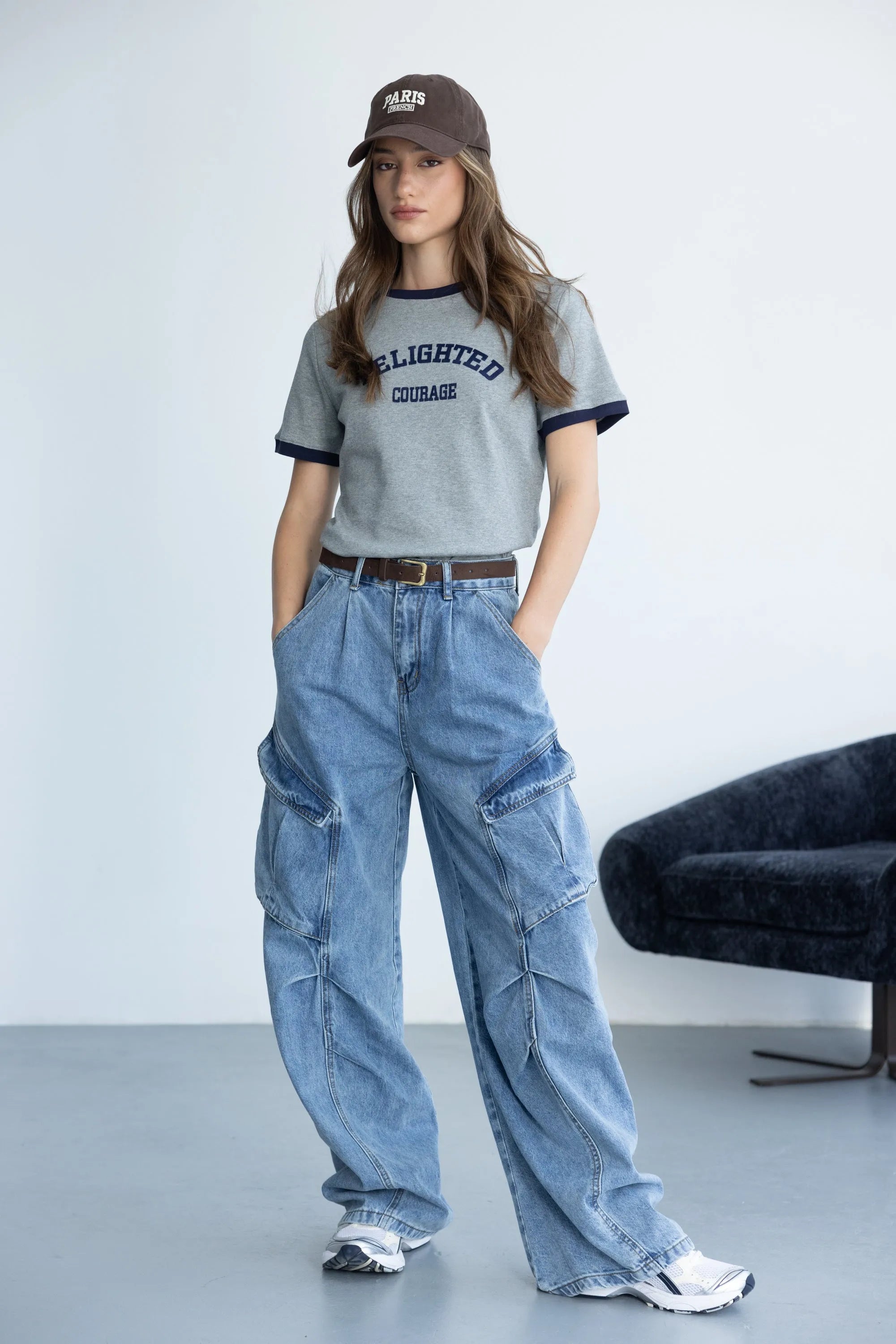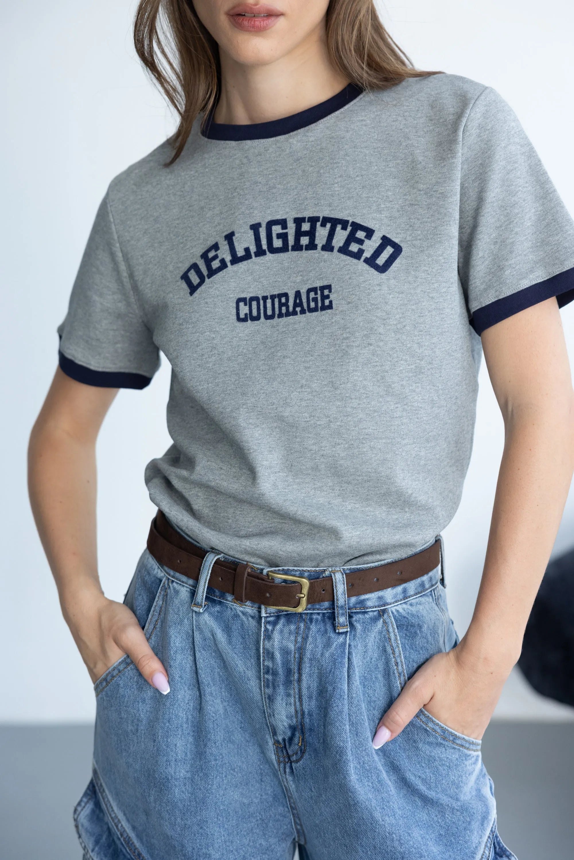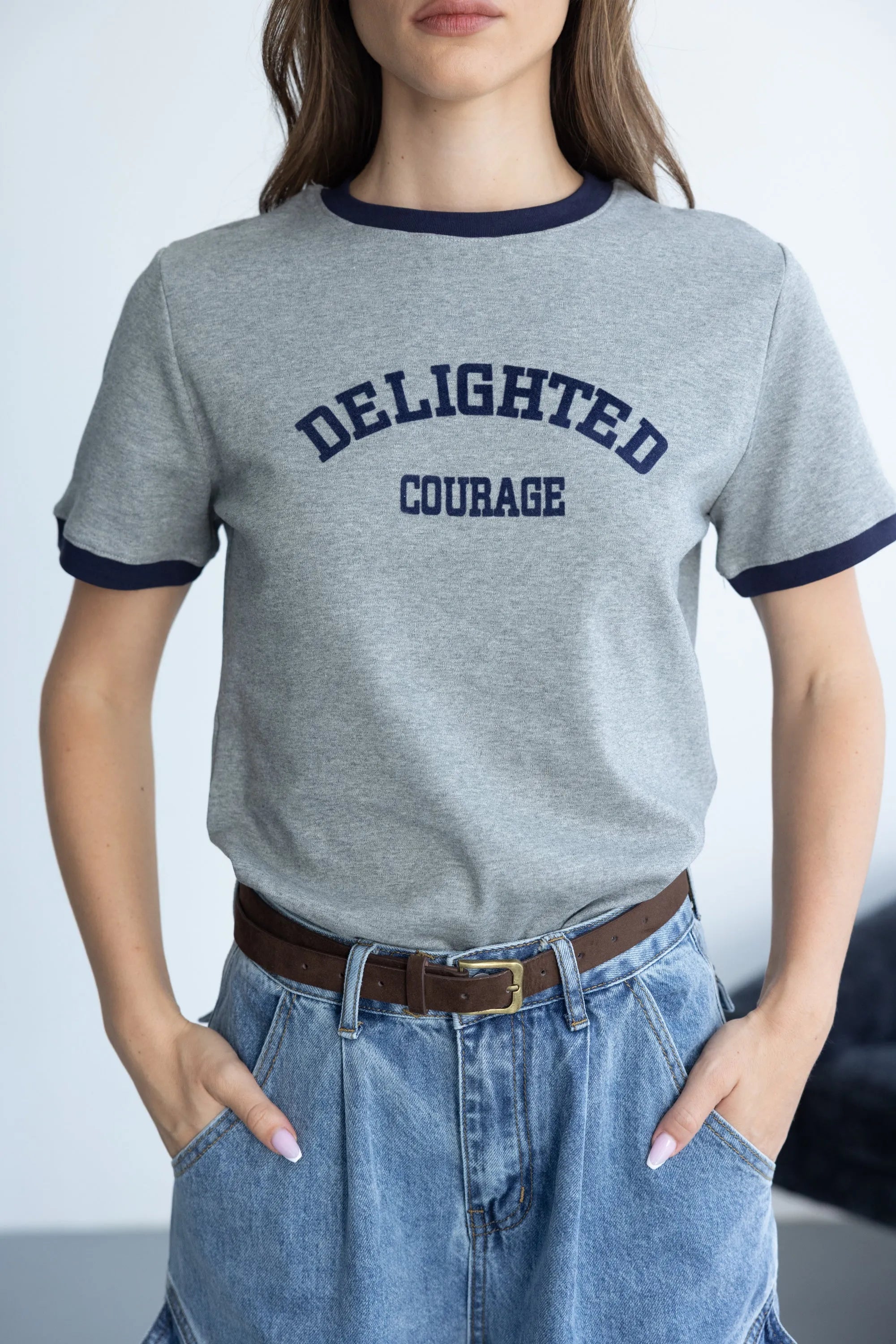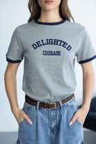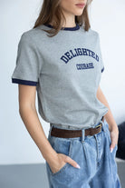 חולצת בייסיק בגזרה נוחה, מבד נעים ביותר ובשילוב צווארון ניקי עגול קלאסי וכיתוב טרנדי בצבע כחול כהה.